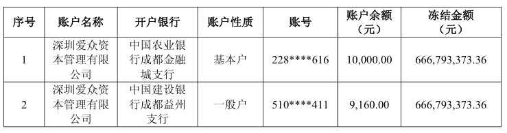 爱众资本通过银行查询获悉其两个银行账户被冻结,情况如下。本次银行账户实际被冻结金额为1.92万元,占公司最近一期经审计归属于上市公司股东净资产的0.0004%,占公司最近一期经审计货币资金的0.0038%。 公司及爱众资本正积极研判,依法申请再审,同时推进与西藏联合达成执行和解, 维护公司合法权益。